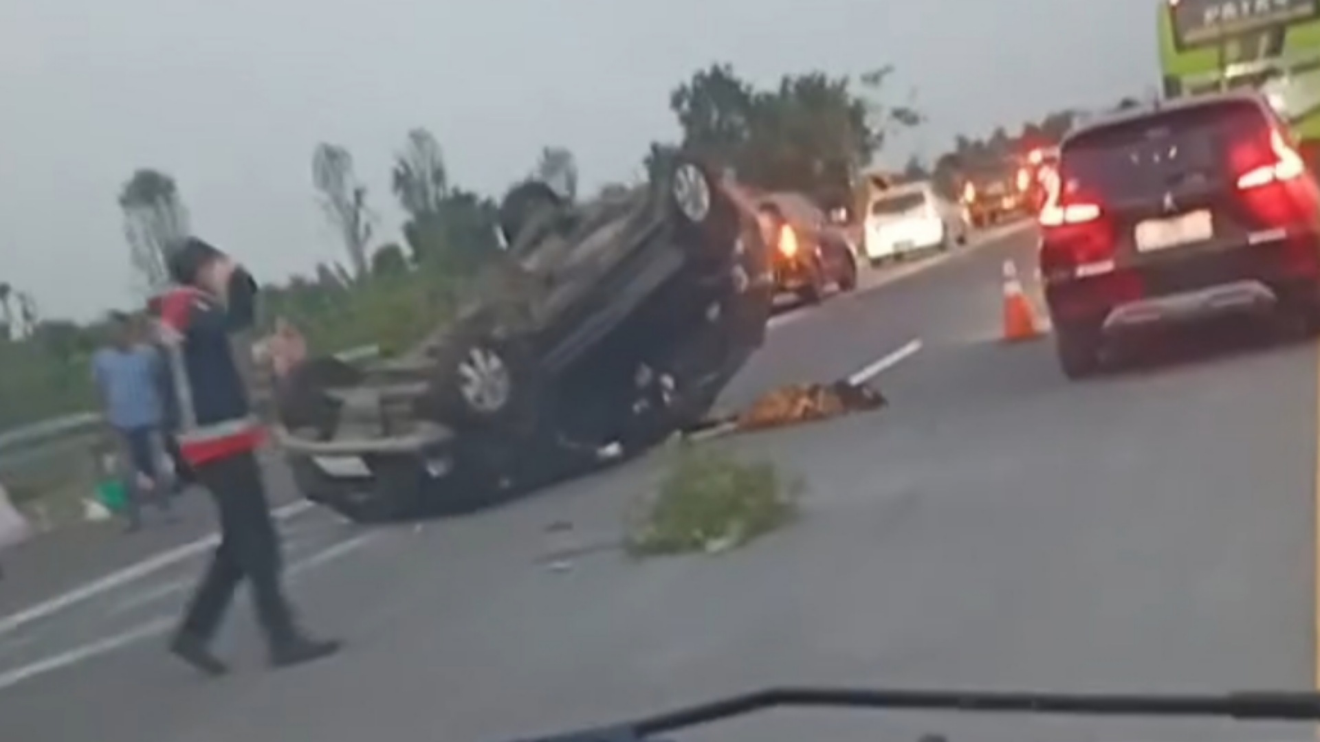 «El coche originalmente circulaba normalmente desde Surabaya hacia Probolinggo. Sin embargo, cuando el neumático explotó, el conductor perdió el control y el coche volcó», dijo Ipda Firman, Comité PJR de Peaje de Probolinggo.